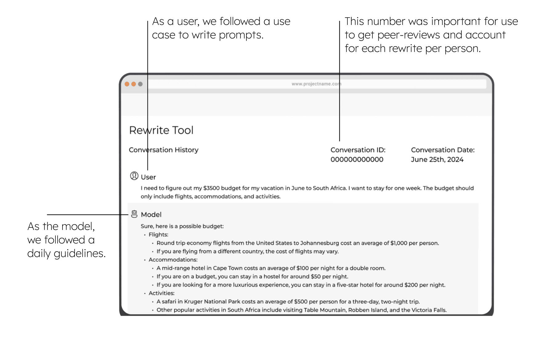 Before the LLM began producing responses, I created prompts and drafted my own replies to test early tone and style guidelines. This hands-on approach gave me a deep understanding of what made a response feel natural, informative, and safe. It also surfaced early challenges—hallucinations, awkward phrasing, and inconsistent, vague tone—which helped shape our rewrite standards moving forward.